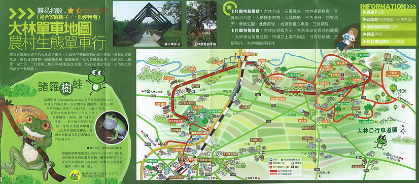 隱生在鄉間小道中的大林自行車道,沿線除了體驗閑靜的農村景觀,清新的農田氣息,還有台灣難得一見的原生種--諸羅樹蛙;從大林糖廠出發,沿線串起大糖里,湖北里,三村里與三角里等4個社區生活圈,全長7公里的路程,自然與生態的結合一覽無遺。
